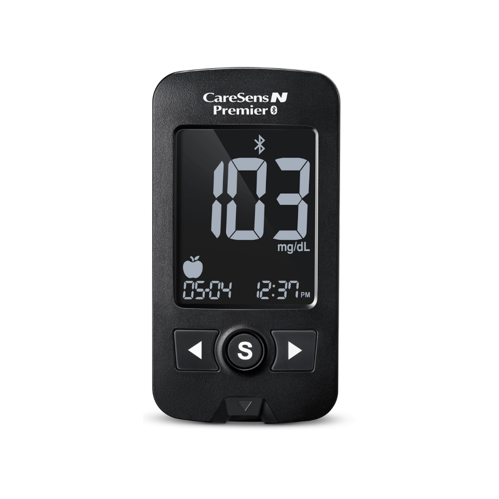 Incluye: Medidor de Glucosa N Premier CareSens c/ Bluetooth, 2 baterías, dispositivo de Punción, estuche Portátil, Manual de Uso, Guía de Referencia Rápida y Libreta de Registros.